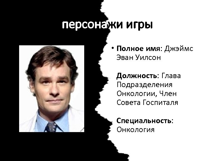 персонажи игры • Полное имя: Джэймс Эван Уилсон Должность: Глава Подразделения Онкологии, Член Совета Госпиталя Специальность: Онкология