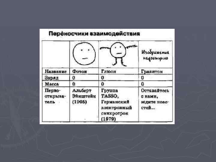 Гравитационное взаимодействие В нем участвует все, что имеет энергию, а не только массу. Например, фотон в гравитационном поле может «краснеть» . ОТО геометрическая теория. В квантовой теории переносчик гравитон.