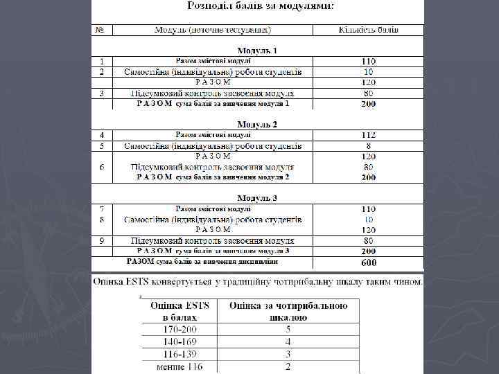 Модуль 1. Математична обробка медико-біологічних даних Змістові модулі: Основи математичного аналізу. Основи теорії ймовірності та математичної статистики. Модуль 2. Основи біофізики Змістові модулі: Основи біомеханіки, біоакустики, біореології та гемодинаміки. Термодинаміка біологічних систем. Біофізика мембранних процесів. Модуль 3. Основи медичної фізики Змістові модулі: Електродинаміка, ії медичне застосування. Основи медичної апаратури. Оптичні методи та їх використання у біології та медицині. Квантово-механічні методи дослідження. Радіаційна фізика. Основи дозиметрії. Аудиторне навантаження – 66, 7%, СРС – 33, 3%.