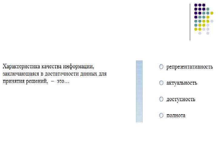 Как атрибут информации не может рассматриваться |1. Новизна |2. Актуальность |3. Достоверность |4. Мощность |5. Объективность |6. Полнота |7. Ценность