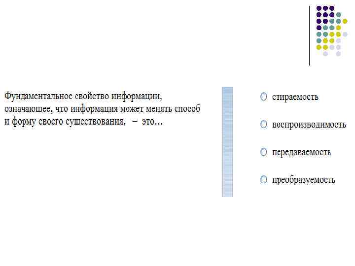 Информация обладает рядом фундаментальных свойств (атрибутов): новизна актуальность достоверность объективность полнота ценность преобразуемость и др.