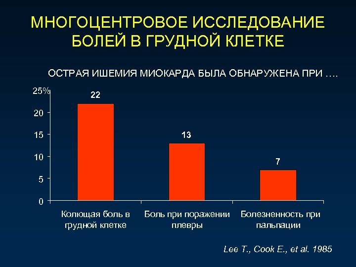 МНОГОЦЕНТРОВОЕ ИССЛЕДОВАНИЕ БОЛЕЙ В ГРУДНОЙ КЛЕТКЕ ОСТРАЯ ИШЕМИЯ МИОКАРДА БЫЛА ОБНАРУЖЕНА ПРИ …. 25% 22 20 13 15 10 7 5 0 Колющая боль в грудной клетке Боль при поражении плевры Болезненность при пальпации Lee T. , Cook E. , et al. 1985