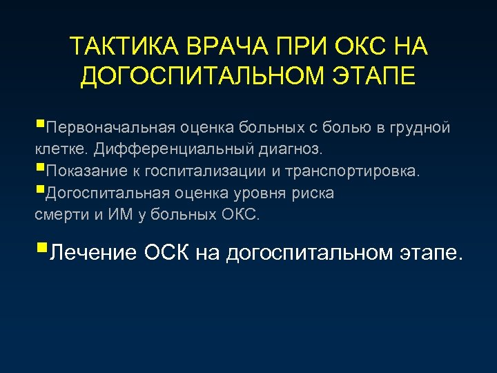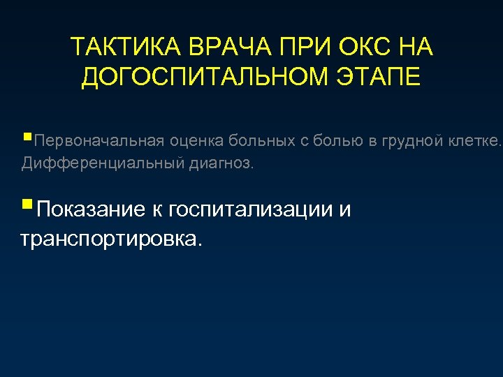 ТАКТИКА ВРАЧА ПРИ ОКС НА ДОГОСПИТАЛЬНОМ ЭТАПЕ §Первоначальная оценка больных с болью в грудной клетке. Дифференциальный диагноз. §Показание к госпитализации и транспортировка. §Догоспитальная оценка уровня риска смерти и ИМ у больных ОКС. §Лечение ОСК на догоспитальном этапе.
