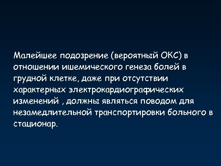 Малейшее подозрение (вероятный ОКС) в отношении ишемического генеза болей в грудной клетке, даже при отсутствии характерных электрокардиографических изменений , должны являться поводом для незамедлительной транспортировки больного в стационар.