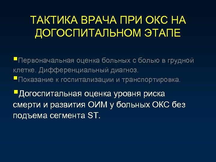 ТАКТИКА ВРАЧА ПРИ ОКС НА ДОГОСПИТАЛЬНОМ ЭТАПЕ §Первоначальная оценка больных с болью в грудной клетке. Дифференциальный диагноз. §Показание к госпитализации и транспортировка. §Догоспитальная оценка уровня риска смерти и развития ОИМ у больных ОКС без подъема сегмента ST.