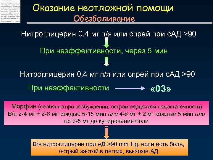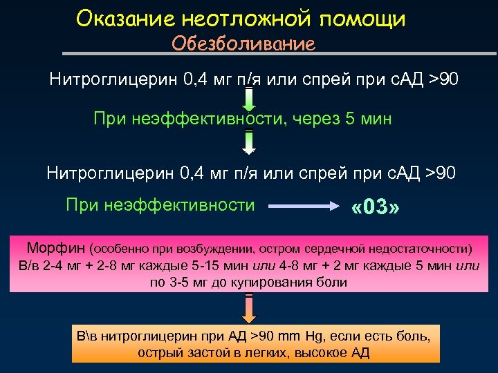 Оказание неотложной помощи Обезболивание Нитроглицерин 0, 4 мг п/я или спрей при с. АД >90 При неэффективности, через 5 мин Нитроглицерин 0, 4 мг п/я или спрей при с. АД >90 При неэффективности « 03» Морфин (особенно при возбуждении, остром сердечной недостаточности) В/в 2 -4 мг + 2 -8 мг каждые 5 -15 мин или 4 -8 мг + 2 мг каждые 5 мин или по 3 -5 мг до купирования боли Вв нитроглицерин при АД >90 mm Hg, если есть боль, острый застой в легких, высокое АД