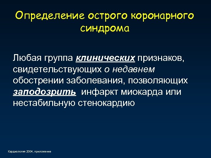 Определение острого коронарного синдрома Любая группа клинических признаков, свидетельствующих о недавнем обострении заболевания, позволяющих заподозрить инфаркт миокарда или нестабильную стенокардию Кардиология 2004, приложение