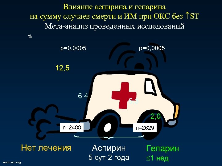 Влияние аспирина и гепарина на сумму случаев смерти и ИМ при ОКС без ST Мета-анализ проведенных исследований % p=0, 0005 12, 5 6, 4 5, 3 2, 0 n=2488 Нет лечения www. acc. org n=2629 Аспирин 5 сут-2 года Гепарин 1 нед