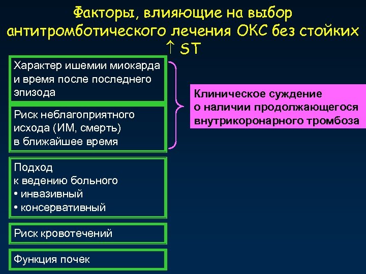 Факторы, влияющие на выбор антитромботического лечения ОКС без стойких ST Характер ишемии миокарда и время последнего эпизода Риск неблагоприятного исхода (ИМ, смерть) в ближайшее время Подход к ведению больного • инвазивный • консервативный Риск кровотечений Функция почек Клиническое суждение о наличии продолжающегося внутрикоронарного тромбоза