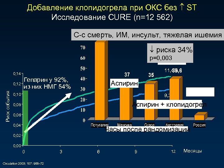Добавление клопидогрела при ОКС без ST Исследование CURE (n=12 562) С-с смерть, ИМ, инсульт, тяжелая ишемия риска 34% р=0, 003 11, 4% 0, 14 Риск события 0, 12 Гепарин у 92%, из них НМГ 54% Аспирин 0, 10 9, 3% 0, 08 Аспирин + клопидогрел 0, 06 0, 04 Часы после рандомизации 0, 02 0, 00 0 Circulation 2003; 107: 966– 72 3 6 9 12 Месяцы