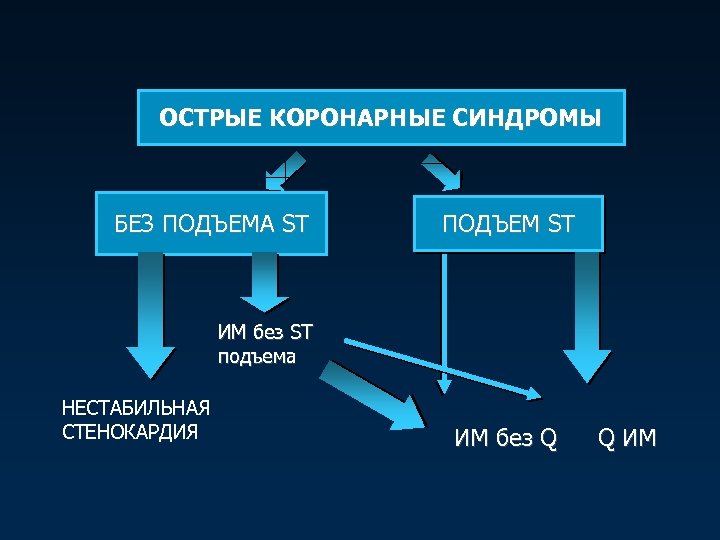 ОСТРЫЕ КОРОНАРНЫЕ СИНДРОМЫ БЕЗ ПОДЪЕМА ST ПОДЪЕМ ST ИМ без ST подъема НЕСТАБИЛЬНАЯ СТЕНОКАРДИЯ ИМ без Q Q ИМ