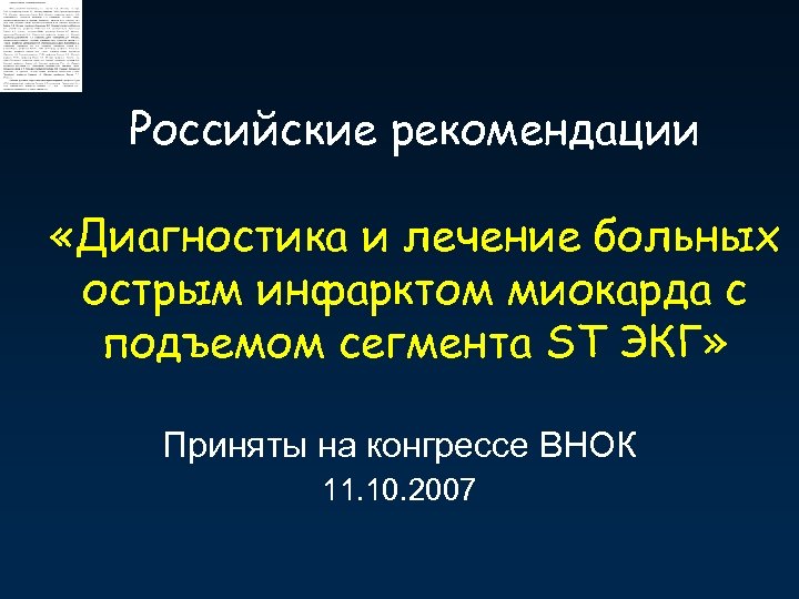 Российские рекомендации «Диагностика и лечение больных острым инфарктом миокарда с подъемом сегмента ST ЭКГ» Приняты на конгрессе ВНОК 11. 10. 2007