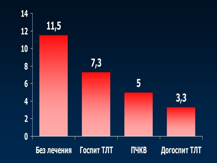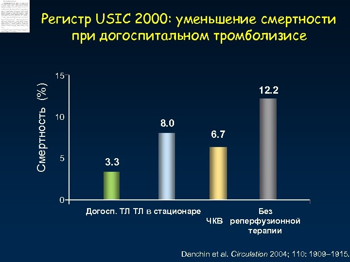 Регистр USIC 2000: уменьшение смертности при догоспитальном тромболизисе Смертность (%) 15 12. 2 10 5 8. 0 6. 7 3. 3 0 Догосп. ТЛ ТЛ в стационаре Без ЧКВ реперфузионной терапии Danchin et al. Circulation 2004; 110: 1909– 1915.