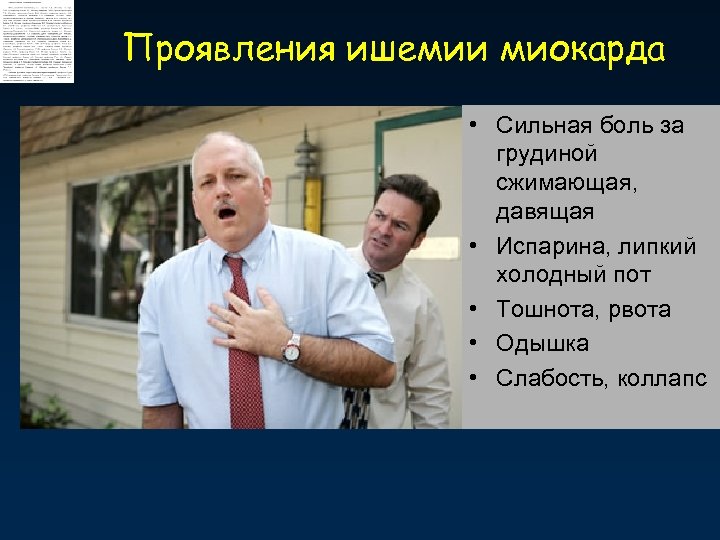 Проявления ишемии миокарда • Сильная боль за грудиной сжимающая, давящая • Испарина, липкий холодный пот • Тошнота, рвота • Одышка • Слабость, коллапс