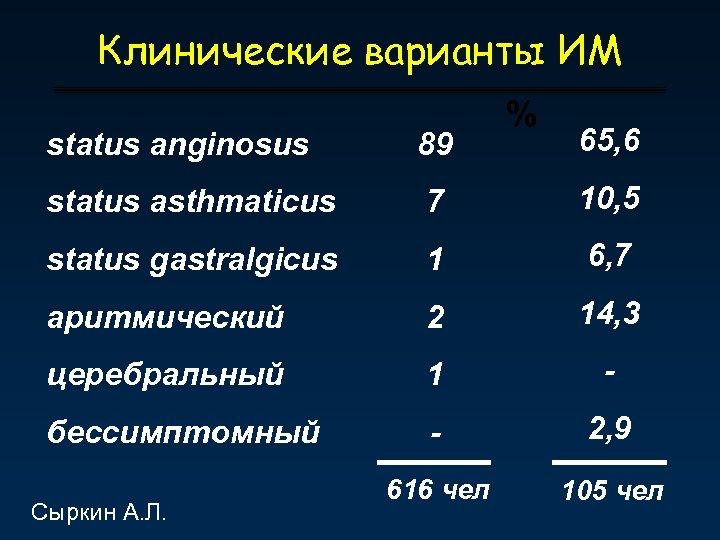 Клинические варианты ИМ % 65, 6 status anginosus 89 status asthmaticus 7 10, 5 status gastralgicus 1 6, 7 аритмический 2 14, 3 церебральный 1 - бессимптомный - 2, 9 616 чел 105 чел Сыркин А. Л.