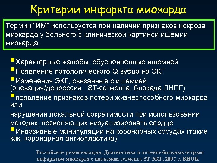 Критерии инфаркта миокарда Термин “ИМ” используется при наличии признаков некроза миокарда у больного с клинической картиной ишемии миокарда. §Характерные жалобы, обусловленные ишемией §Появление патологического Q-зубца на ЭКГ §Изменения ЭКГ, связанные с ишемией (элевация/депрессия ST-сегмента, блокада ЛНПГ) §появление признаков потери жизнеспособного миокарда или нарушений локальной сократимости при использовании методик, позволяющих визуализировать сердце Инвазивные манипуляции на коронарных сосудах (такие как, коронарная ангиопластика) § Российские рекомендации. Диагностика и лечение больных острым инфарктом миокарда с подъемом сегмента ST ЭКГ. 2007 г. ВНОК