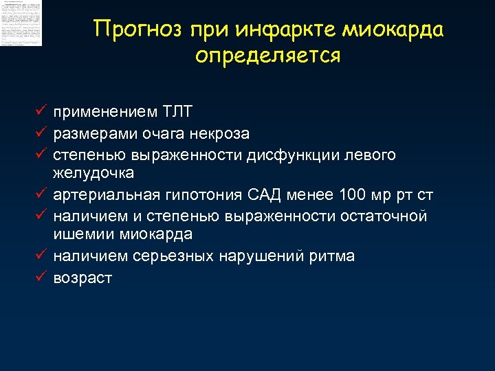Прогноз при инфаркте миокарда определяется ü применением ТЛТ ü размерами очага некроза ü степенью выраженности дисфункции левого желудочка ü артериальная гипотония САД менее 100 мр рт ст ü наличием и степенью выраженности остаточной ишемии миокарда ü наличием серьезных нарушений ритма ü возраст