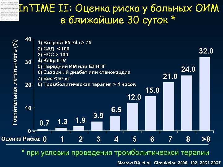 Госпитальная летальность (%) In. TIME II: Оценка риска у больных ОИМ в ближайшие 30 суток * 40 30 20 1) Возраст 65 -74 / 75 2) САД < 100 3) ЧСС > 100 4) Killip II-IV 5) Передний ИМ или БЛНПГ 6) Сахарный диабет или стенокардия 7) Вес < 67 кг 8) Тромболитическая терапия > 4 часов 12. 0 10 0. 7 0 Оценка Риска: 0 1. 3 1. 9 1 2 3. 9 3 32. 0 21. 0 24. 0 15. 0 6. 5 4 5 6 7 8 >8 * при условии проведения тромболитической терапии Morrow DA et al. Circulation 2000; 102: 2031 -2037