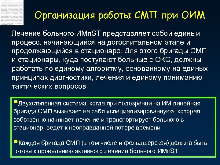 Организация работы СМП при ОИМ Лечение больного ИМп. ST представляет собой единый процесс, начинающийся на догоспитальном этапе и продолжающийся в стационаре. Для этого бригады СМП и стационары, куда поступают больные с ОКС, должны работать по единому алгоритму, основанному на единых принципах диагностики, лечения и единому пониманию тактических вопросов §Двухстепенная система, когда при подозрении на ИМ линейная бригада СМП вызывает на себя «специализированную» , которая собственно начинает лечение и транспортирует больного в стационар, ведет к неоправданной потере времени §Каждая бригада СМП (в том числе и фельдшерская) должна быть готова к проведению активного лечения больного ИМп. ST