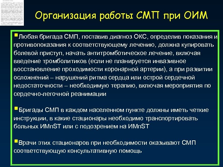 Организация работы СМП при ОИМ §Любая бригада СМП, поставив диагноз ОКС, определив показания и противопоказания к соответствующему лечению, должна купировать болевой приступ, начать антитромботическое лечение, включая введение тромболитиков (если не планируется инвазивное восстановление проходимости коронарной артерии), а при развитии осложнений – нарушений ритма сердца или острой сердечной недостаточности – необходимую терапию, включая мероприятия по сердечно-легочной реанимации §Бригады СМП в каждом населенном пункте должны иметь четкие инструкции, в какие стационары необходимо транспортировать больных ИМп. ST или с подозрением на ИМп. ST §Врачи этих стационаров при необходимости оказывают СМП соответствующую консультативную помощь