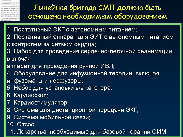 Линейная бригада СМП должна быть оснащена необходимым оборудованием 1. Портативный ЭКГ с автономным питанием; 2. Портативный аппарат для ЭИТ с автономным питанием с контролем за ритмом сердца; 3. Набор для проведения сердечно-легочной реанимации, включая аппарат для проведения ручной ИВЛ; 4. Оборудование для инфузионной терапии, включая инфузоматы и перфузоры; 5. Набор для установки в/в катетера; 6. Кардиоскоп; 7. Кардиостимулятор; 8. Система для дистанционной передачи ЭКГ; 9. Система мобильной связи; 10. Отсос; 11. Лекарства, необходимые для базовой терапии ОИМ