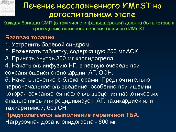Лечение неосложненного ИМп. ST на догоспитальном этапе Каждая бригада СМП (в том числе и фельдшерская) должна быть готова к проведению активного лечения больного ИМп. ST Базовая терапия. 1. Устранить болевой синдром. 2. Разжевать таблетку, содержащую 250 мг АСК. 3. Принять внутрь 300 мг клопидогрела. 4. Начать в/в инфузию НГ, в первую очередь при сохраняющейся стенокардии, АГ, ОСН. 5. Начать лечение b-блокаторами. Предпочтительно первоначальное в/в введение, особенно при ишемии, которая сохраняется после в/в введения наркотических анальгетиков или рецидивирует, АГ, тахикардией или тахиаритмией, без СН. Предполагается выполнение первичной ТБА. Нагрузочная доза клопидогрела - 600 мг.