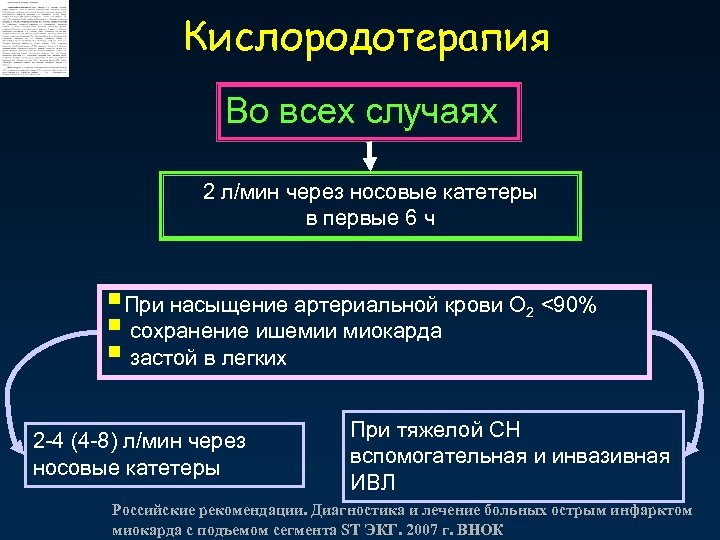 Кислородотерапия Во всех случаях 2 л/мин через носовые катетеры в первые 6 ч §При насыщение артериальной крови O § сохранение ишемии миокарда § застой в легких 2 -4 (4 -8) л/мин через носовые катетеры 2 <90% При тяжелой СН вспомогательная и инвазивная ИВЛ Российские рекомендации. Диагностика и лечение больных острым инфарктом миокарда с подъемом сегмента ST ЭКГ. 2007 г. ВНОК