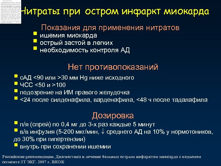 Нитраты при остром инфаркт миокарда Показания для применения нитратов § ишемия миокарда § острый застой в легких § необходимость контроля АД Нет противопоказаний § с. АД <90 или >30 мм Hg ниже исходного § ЧСС <50 и >100 § подозрение на ИМ правого желудочка § <24 после силденафила, варденафила, <48 ч после тадалафила Дозировка § п/я (спрей) по 0, 4 мг до 3 -х раз каждые 5 минут § в/в инфузия (5 -200 мкг/мин, среднего АД на 10% у нормотоников, до 30% при гипертензии) § внутрь при сохранении ишемии Российские рекомендации. Диагностика и лечение больных острым инфарктом миокарда с подъемом сегмента ST ЭКГ. 2007 г. ВНОК
