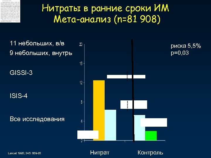 Нитраты в ранние сроки ИМ Мета-анализ (n=81 908) 11 небольших, в/в 9 небольших, внутрь риска 5, 5% р=0, 03 GISSI-3 ISIS-4 Все исследования Lancet 1995; 345: 669 -85 Нитрат Контроль