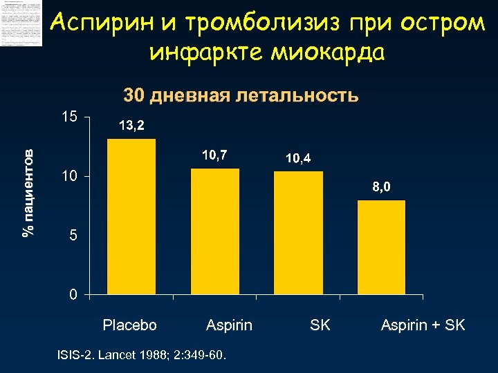 Аспирин и тромболизиз при остром инфаркте миокарда % пациентов 30 дневная летальность Placebo Aspirin ISIS-2. Lancet 1988; 2: 349 -60. SK Aspirin + SK