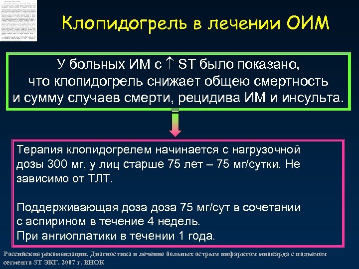 Клопидогрель в лечении ОИМ У больных ИМ с ST было показано, что клопидогрель снижает общею смертность и сумму случаев смерти, рецидива ИМ и инсульта. Терапия клопидогрелем начинается с нагрузочной дозы 300 мг, у лиц старше 75 лет – 75 мг/сутки. Не зависимо от ТЛТ. Поддерживающая доза 75 мг/сут в сочетании с аспирином в течение 4 недель. При ангиоплатики в течении 1 года. Российские рекомендации. Диагностика и лечение больных острым инфарктом миокарда с подъемом сегмента ST ЭКГ. 2007 г. ВНОК