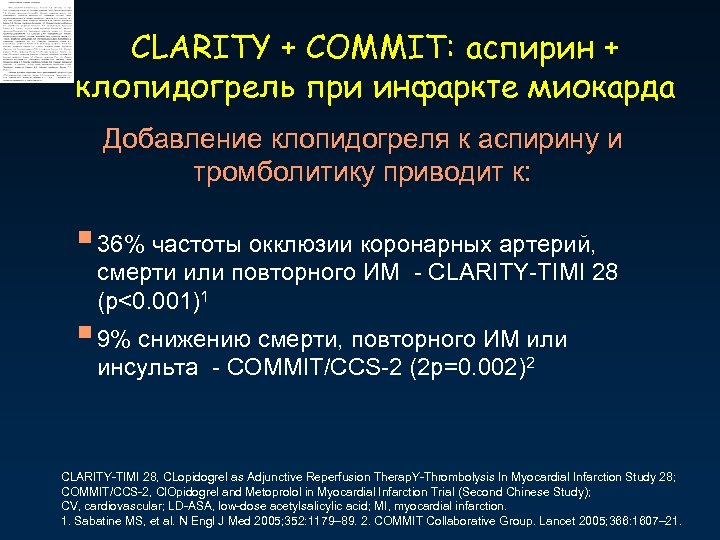CLARITY + COMMIT: аспирин + клопидогрель при инфаркте миокарда Добавление клопидогреля к аспирину и тромболитику приводит к: § 36% частоты окклюзии коронарных артерий, смерти или повторного ИМ - CLARITY-TIMI 28 (p<0. 001)1 § 9% снижению смерти, повторного ИМ или инсульта - COMMIT/CCS-2 (2 p=0. 002)2 CLARITY-TIMI 28, CLopidogrel as Adjunctive Reperfusion Therap. Y-Thrombolysis In Myocardial Infarction Study 28; COMMIT/CCS-2, Cl. Opidogrel and Metoprolol in Myocardial Infarction Trial (Second Chinese Study); CV, cardiovascular; LD-ASA, low-dose acetylsalicylic acid; MI, myocardial infarction. 1. Sabatine MS, et al. N Engl J Med 2005; 352: 1179– 89. 2. COMMIT Collaborative Group. Lancet 2005; 366: 1607– 21.