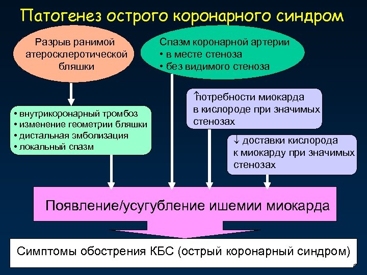 Патогенез острого коронарного синдром Разрыв ранимой атеросклеротической бляшки • внутрикоронарный тромбоз • изменение геометрии бляшки • дистальная эмболизация • локальный спазм Спазм коронарной артерии • в месте стеноза • без видимого стеноза потребности миокарда в кислороде при значимых стенозах доставки кислорода к миокарду при значимых стенозах Появление/усугубление ишемии миокарда Симптомы обострения КБС (острый коронарный синдром)