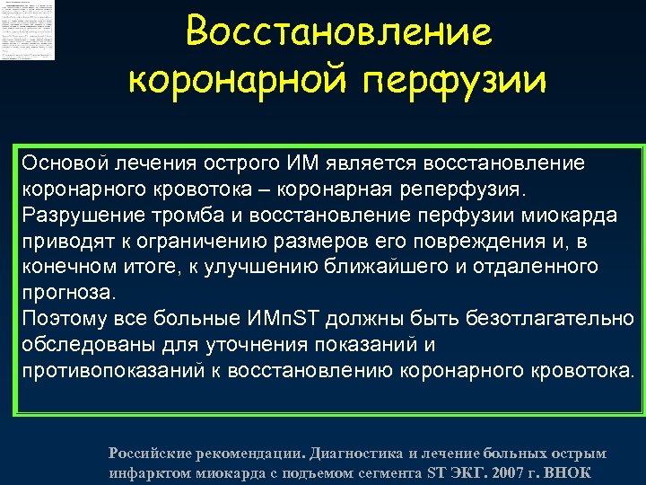 Восстановление коронарной перфузии Основой лечения острого ИМ является восстановление коронарного кровотока – коронарная реперфузия. Разрушение тромба и восстановление перфузии миокарда приводят к ограничению размеров его повреждения и, в конечном итоге, к улучшению ближайшего и отдаленного прогноза. Поэтому все больные ИМп. ST должны быть безотлагательно обследованы для уточнения показаний и противопоказаний к восстановлению коронарного кровотока. Российские рекомендации. Диагностика и лечение больных острым инфарктом миокарда с подъемом сегмента ST ЭКГ. 2007 г. ВНОК