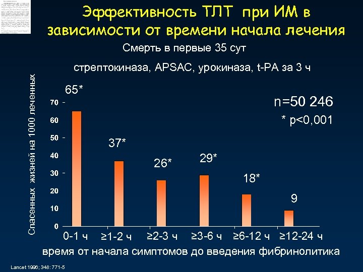 Эффективность ТЛТ при ИМ в зависимости от времени начала лечения Смерть в первые 35 сут Спасенных жизней на 1000 леченных стрептокиназа, APSAC, урокиназа, t-PA за 3 ч 65* n=50 246 * р<0, 001 37* 26* 29* 18* 9 0 -1 ч ≥ 1 -2 ч ≥ 2 -3 ч ≥ 3 -6 ч ≥ 6 -12 ч ≥ 12 -24 ч время от начала симптомов до введения фибринолитика Lancet 1996; 348: 771 -5