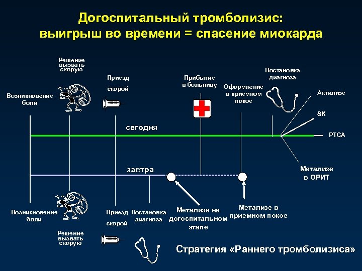 Догоспитальный тромболизис: выигрыш во времени = спасение миокарда Решение вызвать скорую Приезд скорой Прибытие в больницу Возникновение боли Постановка диагноза Оформление в приемном покое Актилизе SK сегодня PTCA Метализе в ОРИТ завтра Возникновение боли Решение вызвать скорую Метализе в Метализе на Приезд Постановка приемном покое диагноза догоспитальном скорой этапе Стратегия «Раннего тромболизиса»