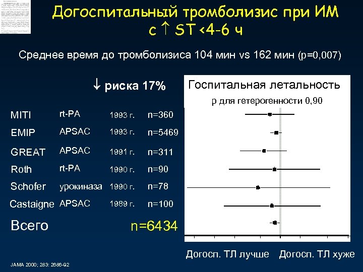 Догоспитальный тромболизис при ИМ с ST <4 -6 ч Среднее время до тромболизиса 104 мин vs 162 мин (р=0, 007) риска 17% Госпитальная летальность р для гетерогенности 0, 90 MITI rt-PA 1993 г. n=360 EMIP APSAC 1993 г. n=5469 GREAT APSAC 1991 г. n=311 Roth rt-PA 1990 г. n=90 Schofer урокиназа 1990 г. n=78 Castaigne APSAC Всего 1989 г. n=100 n=6434 Догосп. ТЛ лучше Догосп. ТЛ хуже JAMA 2000; 283: 2686 -92