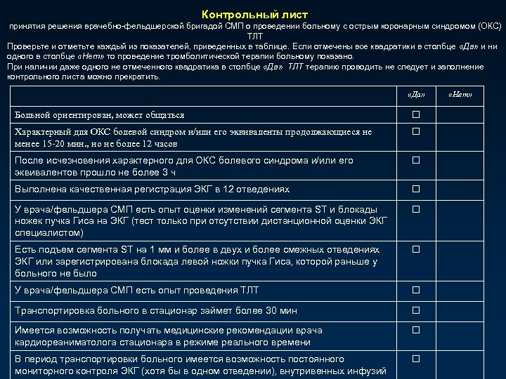 Контрольный лист принятия решения врачебно-фельдшерской бригадой СМП о проведении больному с острым коронарным синдромом (ОКС) ТЛТ Проверьте и отметьте каждый из показателей, приведенных в таблице. Если отмечены все квадратики в столбце «Да» и ни одного в столбце «Нет» то проведение тромболитической терапии больному показано. При наличии даже одного не отмеченного квадратика в столбце «Да» ТЛТ терапию проводить не следует и заполнение контрольного листа можно прекратить. «Да» Больной ориентирован, может общаться Характерный для ОКС болевой синдром и/или его эквиваленты продолжающиеся не менее 15 -20 мин. , но не более 12 часов После исчезновения характерного для ОКС болевого синдрома и/или его эквивалентов прошло не более 3 ч Выполнена качественная регистрация ЭКГ в 12 отведениях У врача/фельдшера СМП есть опыт оценки изменений сегмента ST и блокады ножек пучка Гиса на ЭКГ (тест только при отсутствии дистанционной оценки ЭКГ специалистом) Есть подъем сегмента ST на 1 мм и более в двух и более смежных отведениях ЭКГ или зарегистрирована блокада левой ножки пучка Гиса, которой раньше у больного не было У врача/фельдшера СМП есть опыт проведения ТЛТ Транспортировка больного в стационар займет более 30 мин Имеется возможность получать медицинские рекомендации врача кардиореаниматолога стационара в режиме реального времени В период транспортировки больного имеется возможность постоянного мониторного контроля ЭКГ (хотя бы в одном отведении), внутривенных инфузий «Нет»