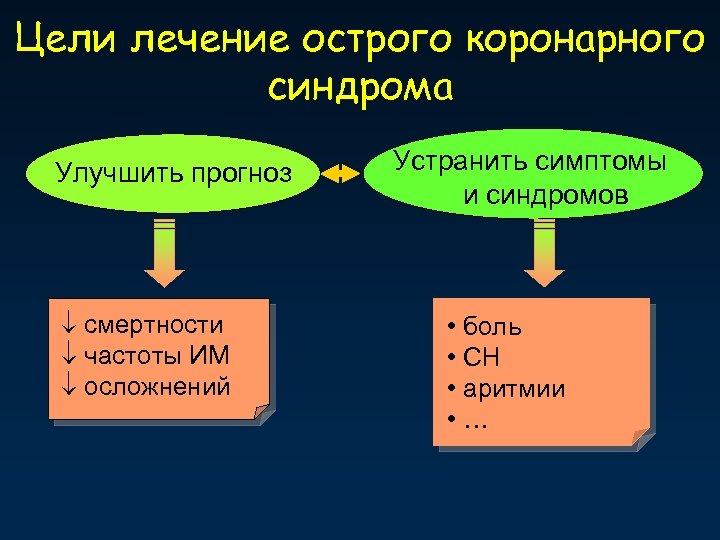 Цели лечение острого коронарного синдрома Улучшить прогноз смертности частоты ИМ осложнений Устранить симптомы и синдромов • боль • СН • аритмии • …