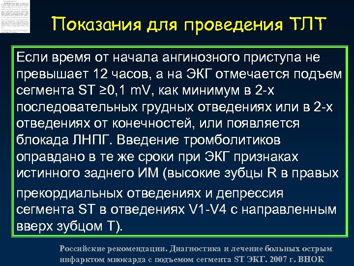Показания для проведения ТЛТ Если время от начала ангинозного приступа не превышает 12 часов, а на ЭКГ отмечается подъем сегмента ST ≥ 0, 1 m. V, как минимум в 2 -х последовательных грудных отведениях или в 2 -х отведениях от конечностей, или появляется блокада ЛНПГ. Введение тромболитиков оправдано в те же сроки при ЭКГ признаках истинного заднего ИМ (высокие зубцы R в правых прекордиальных отведениях и депрессия сегмента ST в отведениях V 1 -V 4 с направленным вверх зубцом T). Российские рекомендации. Диагностика и лечение больных острым инфарктом миокарда с подъемом сегмента ST ЭКГ. 2007 г. ВНОК