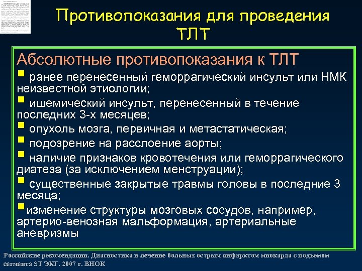 Противопоказания для проведения ТЛТ Абсолютные противопоказания к ТЛТ § ранее перенесенный геморрагический инсульт или НМК неизвестной этиологии; § ишемический инсульт, перенесенный в течение последних 3 -х месяцев; § опухоль мозга, первичная и метастатическая; § подозрение на расслоение аорты; § наличие признаков кровотечения или геморрагического диатеза (за исключением менструации); § существенные закрытые травмы головы в последние 3 месяца; §изменение структуры мозговых сосудов, например, артерио-венозная мальформация, артериальные аневризмы Российские рекомендации. Диагностика и лечение больных острым инфарктом миокарда с подъемом сегмента ST ЭКГ. 2007 г. ВНОК