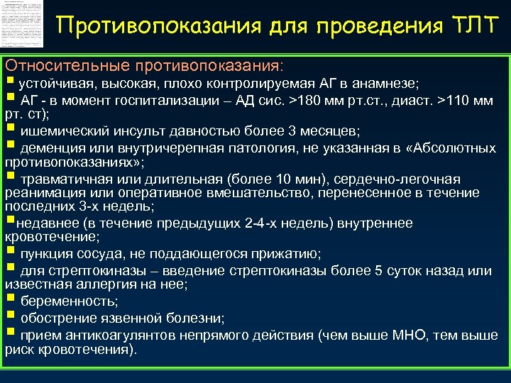 Противопоказания для проведения ТЛТ Относительные противопоказания: § устойчивая, высокая, плохо контролируемая АГ в анамнезе; § АГ - в момент госпитализации – АД сис. >180 мм рт. ст. , диаст. >110 мм рт. ст); § ишемический инсульт давностью более 3 месяцев; § деменция или внутричерепная патология, не указанная в «Абсолютных противопоказаниях» ; § травматичная или длительная (более 10 мин), сердечно-легочная реанимация или оперативное вмешательство, перенесенное в течение последних 3 -х недель; недавнее (в течение предыдущих 2 -4 -х недель) внутреннее кровотечение; пункция сосуда, не поддающегося прижатию; для стрептокиназы – введение стрептокиназы более 5 суток назад или известная аллергия на нее; беременность; обострение язвенной болезни; прием антикоагулянтов непрямого действия (чем выше МНО, тем выше риск кровотечения). § § §