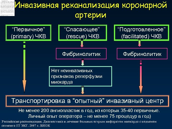 Инвазивная реканализация коронарной артерии “Спасающее” (rescue) ЧКВ “Подготовленное” (facilitated) ЧКВ Фибринолитик “Первичное” (primary) ЧКВ Фибринолитик Нет неинвазивных признаков реперфузии миокарда Транспортировка в “опытный” инвазивный центр Не менее 200 ангиопластик в год, из которых 35 -40 первичные. Личный опыт оператора – не менее 75 процедур в год) Российские рекомендации. Диагностика и лечение больных острым инфарктом миокарда с подъемом сегмента ST ЭКГ. 2007 г. ВНОК