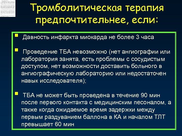 Тромболитическая терапия предпочтительнее, если: § § § Давность инфаркта миокарда не более 3 часа Проведение ТБА невозможно (нет ангиографии или лаборатория занята, есть проблемы с сосудистым доступом, нет возможности доставить больного в ангиографическую лабораторию или недостаточен навык исследователя); ТБА не может быть проведена в течение 90 мин после первого контакта с медицинским песоналом, а также когда ожидаемое время задержки между первым раздуванием баллона в КА и началом ТЛТ превышает 60 мин