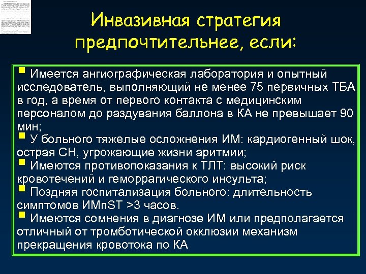 Инвазивная стратегия предпочтительнее, если: § Имеется ангиографическая лаборатория и опытный исследователь, выполняющий не менее 75 первичных ТБА в год, а время от первого контакта с медицинским персоналом до раздувания баллона в КА не превышает 90 мин; У больного тяжелые осложнения ИМ: кардиогенный шок, острая СН, угрожающие жизни аритмии; Имеются противопоказания к ТЛТ: высокий риск кровотечений и геморрагического инсульта; Поздняя госпитализация больного: длительность симптомов ИМп. ST >3 часов. Имеются сомнения в диагнозе ИМ или предполагается отличный от тромботической окклюзии механизм прекращения кровотока по КА § §