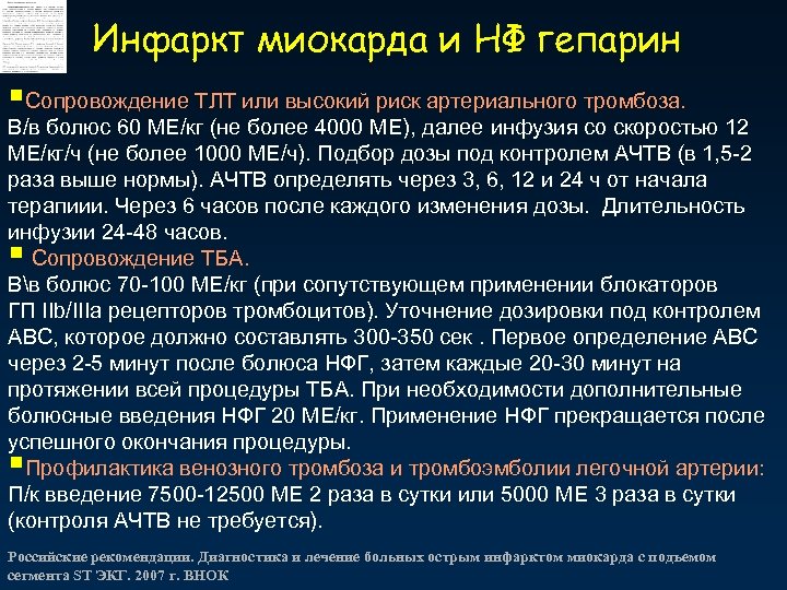 Инфаркт миокарда и НФ гепарин §Сопровождение ТЛТ или высокий риск артериального тромбоза. В/в болюс 60 МЕ/кг (не более 4000 МЕ), далее инфузия со скоростью 12 МЕ/кг/ч (не более 1000 МЕ/ч). Подбор дозы под контролем АЧТВ (в 1, 5 -2 раза выше нормы). АЧТВ определять через 3, 6, 12 и 24 ч от начала терапиии. Через 6 часов после каждого изменения дозы. Длительность инфузии 24 -48 часов. Сопровождение ТБА. Вв болюс 70 -100 МЕ/кг (при сопутствующем применении блокаторов ГП IIb/IIIa рецепторов тромбоцитов). Уточнение дозировки под контролем АВС, которое должно составлять 300 -350 сек. Первое определение АВС через 2 -5 минут после болюса НФГ, затем каждые 20 -30 минут на протяжении всей процедуры ТБА. При необходимости дополнительные болюсные введения НФГ 20 МЕ/кг. Применение НФГ прекращается после успешного окончания процедуры. Профилактика венозного тромбоза и тромбоэмболии легочной артерии: П/к введение 7500 -12500 МЕ 2 раза в сутки или 5000 МЕ 3 раза в сутки (контроля АЧТВ не требуется). § § Российские рекомендации. Диагностика и лечение больных острым инфарктом миокарда с подъемом сегмента ST ЭКГ. 2007 г. ВНОК