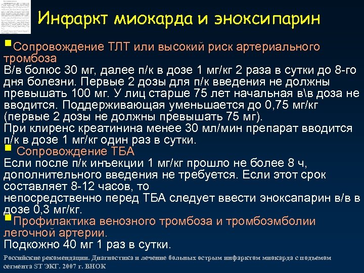 Инфаркт миокарда и эноксипарин §Сопровождение ТЛТ или высокий риск артериального тромбоза В/в болюс 30 мг, далее п/к в дозе 1 мг/кг 2 раза в сутки до 8 -го дня болезни. Первые 2 дозы для п/к введения не должны превышать 100 мг. У лиц старше 75 лет начальная вв доза не вводится. Поддерживающая уменьшается до 0, 75 мг/кг (первые 2 дозы не должны превышать 75 мг). При клиренс креатинина менее 30 мл/мин препарат вводится п/к в дозе 1 мг/кг один раз в сутки. Сопровождение ТБА Если после п/к инъекции 1 мг/кг прошло не более 8 ч, дополнительного введения не требуется. Если этот срок составляет 8 -12 часов, то непосредственно перед ТБА следует ввести эноксапарин в/в в дозе 0, 3 мг/кг. Профилактика венозного тромбоза и тромбоэмболии легочной артерии. Подкожно 40 мг 1 раз в сутки. § § Российские рекомендации. Диагностика и лечение больных острым инфарктом миокарда с подъемом сегмента ST ЭКГ. 2007 г. ВНОК