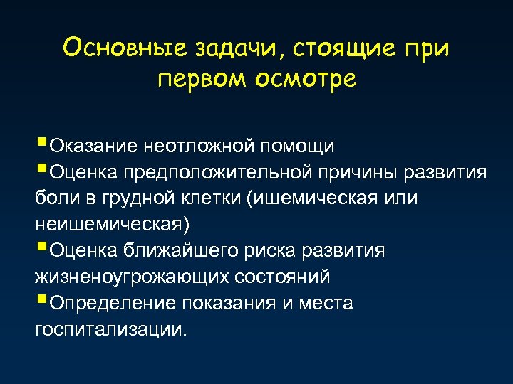 Основные задачи, стоящие при первом осмотре §Оказание неотложной помощи §Оценка предположительной причины развития боли в грудной клетки (ишемическая или неишемическая) §Оценка ближайшего риска развития жизненоугрожающих состояний §Определение показания и места госпитализации.