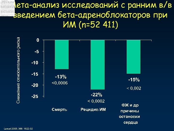 Снижение относительного риска Мета-анализ исследований с ранним в/в введением бета-адреноблокаторов при ИМ (n=52 411) 0 -5 -10 -15 -20 -13% < 0, 002 -22% -25 < 0, 0002 Смерть Lancet 2005; 366: 1622 -32 -15% <0, 0006 Рецидив ИМ ФЖ и др причины остановки сердца