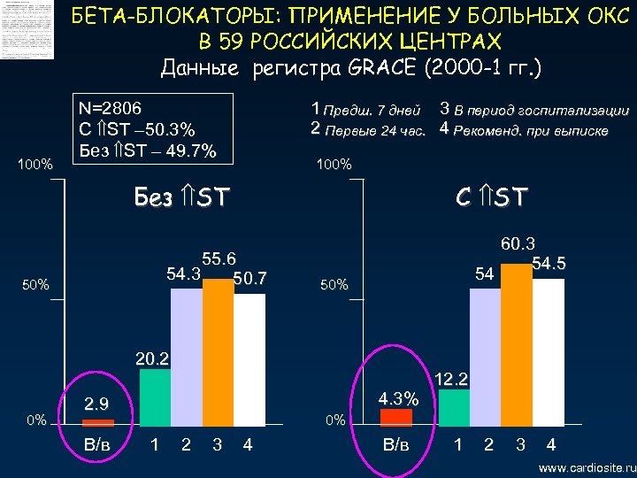 БЕТА-БЛОКАТОРЫ: ПРИМЕНЕНИЕ У БОЛЬНЫХ ОКС В 59 РОССИЙСКИХ ЦЕНТРАХ Данные регистра GRACE (2000 -1 гг. ) 100% N=2806 C ST – 50. 3% Без ST – 49. 7% 1 Предш. 7 дней 3 В период госпитализации 2 Первые 24 час. 4 Рекоменд. при выписке 100% Без ST C ST 55. 6 54. 3 50. 7 50% 54 50% 20. 2 0% 4. 3% 2. 9 В/в 60. 3 54. 5 12. 2 0% 1 2 3 4 В/в 1 2 3 4 www. cardiosite. ru